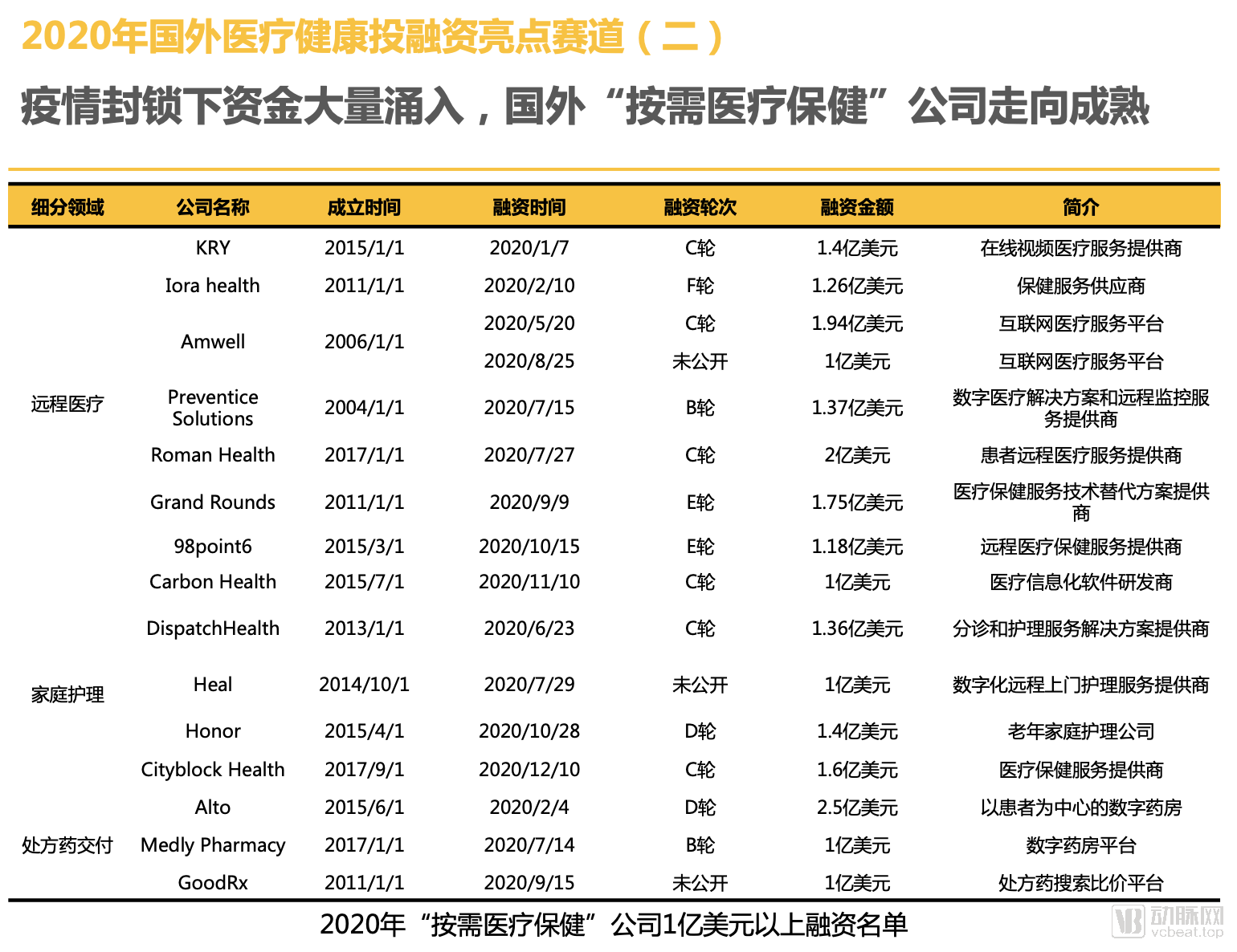 2020年,在国外卫生事件的封锁之下,远程医疗、家庭护理、处方药交付等按需保健公司发展迅速,其中16家相关企业累积融资超1亿美元。