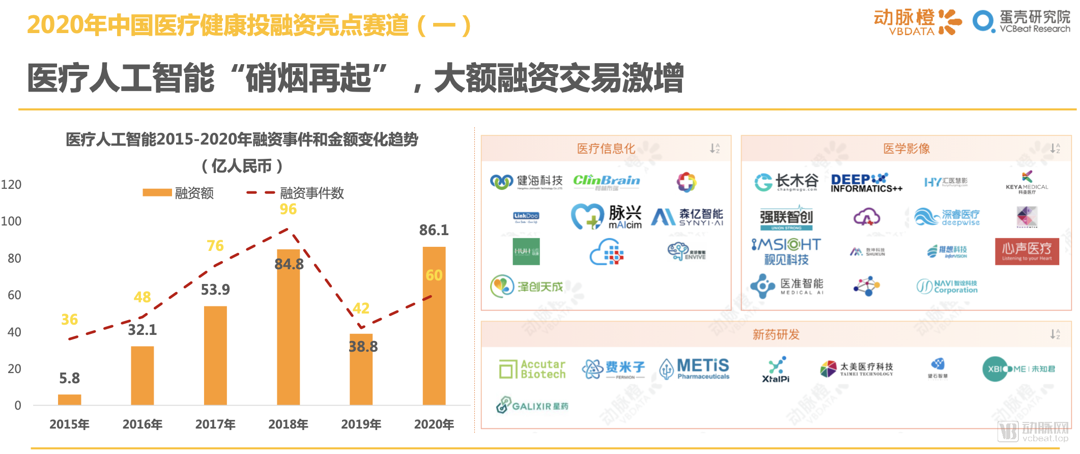 医疗人工智能在2018年的狂欢之后,曾在2019年的一级市场遇冷,全年42次融资,总金额仅38.8亿人民币。但在2020年,这一赛道似乎重获新生,全年发生60起融资,总融资额也达到有史以来的新高86亿人民币。