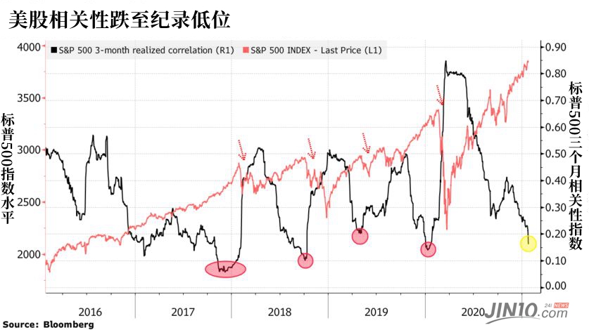 分析称,这个标普相关性指数大幅下跌的主要原因在于拜登当选美国总统后股市发生了轮动,投资者为可能出台的进一步刺激计划调整持仓布局。另外一个原因是,这一轮财报季的到来也促使投资者调仓。