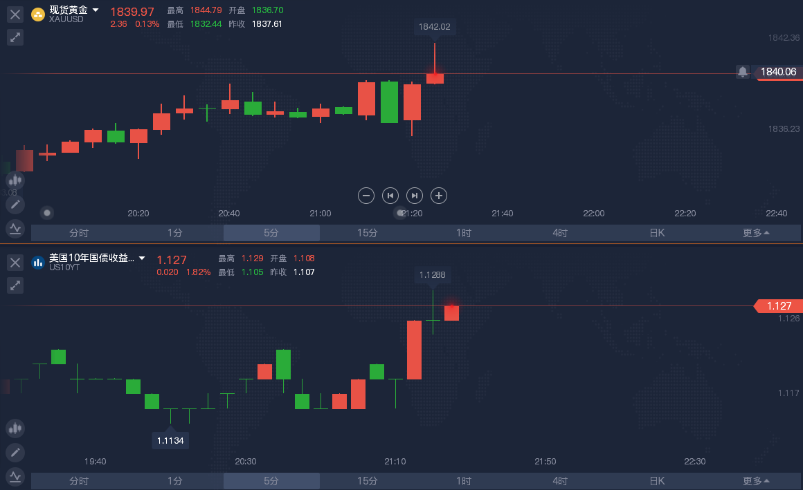 “小非农”ADP数据公布后,美国10年期国债收益率走高,报1.122%;现货黄金短线走低近3美元后走高6美元,在1840附近徘徊。