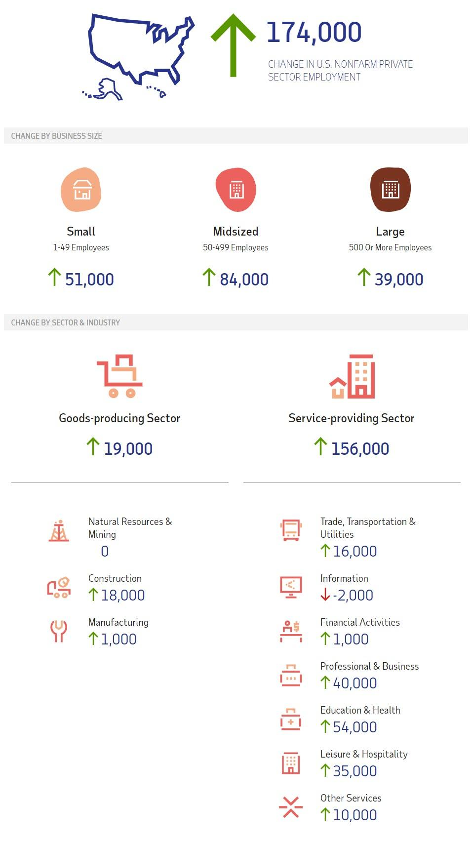 根据ADP的数据,就业人数增加最多的来自卫生保健、社会援助以及专业和商业服务。休闲和酒店业当月增加了3.5万人,建筑业增加1.8万人,制造业就业人数增加0.1万人。