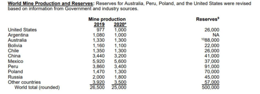 美国地质勘探局2021年的报告显示,白银产量和储量已经见顶(见下面美国地质勘探局的图表)。墨西哥和秘鲁仍然是世界上最大的两个白银生产国,秘鲁是白银储备最多的国家。然而,秘鲁的白银储量已从12万吨下降到9.1万吨。全球白银总储量下降14%,至50.3万吨。白银年总产量从2019年的26500吨下降到2020年的25000吨。可以估计,银将在大约20年后耗尽,因为银矿的平均开采寿命目前只有10年。