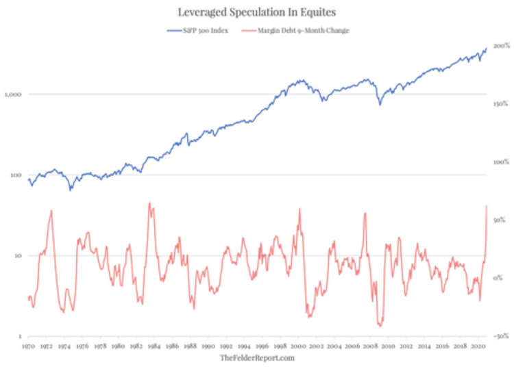 Jesse Felder警告称,历史上,当发生保证金债务飙升的情况时,股市往往会达到峰值。但1972,2000年和2007-1983年的情况是例外,这可能是因为当时估值水平极低,而保证金债务的总量相对较小。