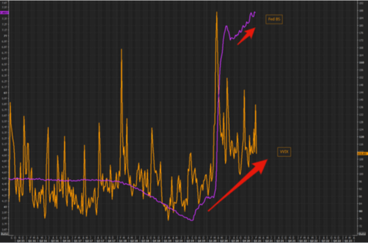 下图显示了美联储的资产负债表和隐含波动率的“结构性定价”,美联储已经扭曲了很多资产价格,其中包括对波动率的定价。