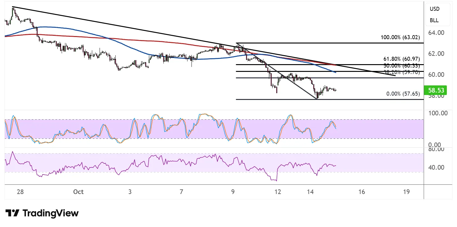 其中,38.2%斐波那契回撤位位于59.70美元,而50%回撤水平则与60.33美元附近的趋势线重合。若反弹进一步延伸,61.8%斐波那契位置60.97美元可能成为修正走势的关键阻力点,也是空头重新入场的重要观察位。