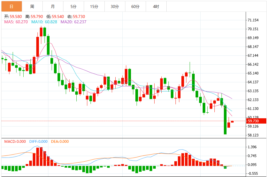 从日线图来看,WTI原油价格仍处于下降通道运行,5日与20日均线呈空头排列,MACD快线跌破零轴后继续下行,表明市场动能偏弱。
