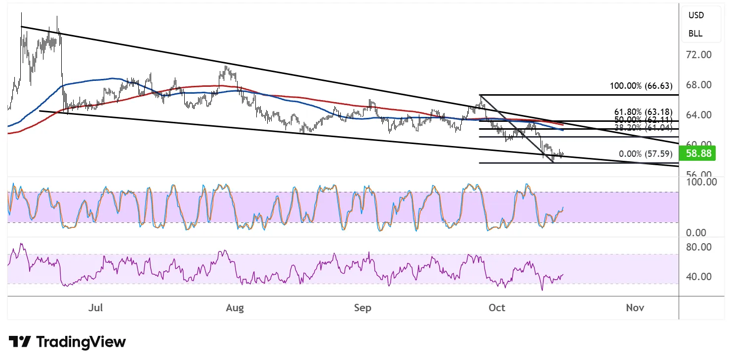 38.2%斐波那契回撤位位于61.04美元,50%水平则处于63.41美元,恰好与楔形上沿阻力重合,或将构成初步压制。若反弹动能进一步增强,则可能触及61.8%斐波那契水平63.18美元,甚至挑战100%回撤位66.63美元,该区域也接近100日均线的动态支撑/阻力位。