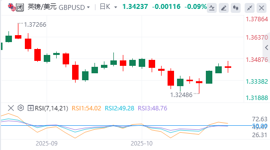 支撑与阻力:英镑/美元已重新站上21日均线(1.3424),14日RSI指标升至52附近,显示短期上涨动能增强。关键阻力位在1.3500心理关口,若突破可能测试1.3600(密集供应区及趋势线阻力)、7月高点1.3681及9月高点1.3763。