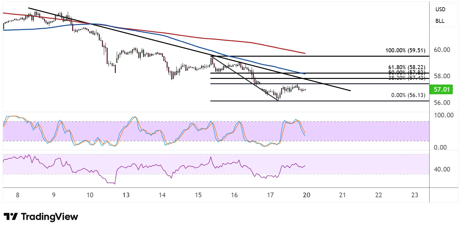 通过斐波那契回撤位观察,卖方可能在哪些位置重新介入值得关注。38.2%的回撤位位于57.42美元,50%水平则在57.82美元。若出现更深的修正,61.8%回撤位58.22美元将成为重要参考点,该位置与短期下行趋势线高度重合,可能成为空头反攻的关键区域。