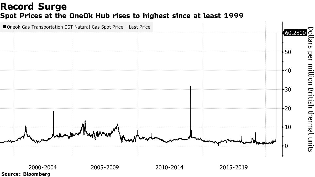 其他州也受到冲击,据报道,俄克拉荷马州的燃气价格在周末的两天内上涨了超4000%。上周五收于377.13美元,但上周初的开盘价格还不到4美元。