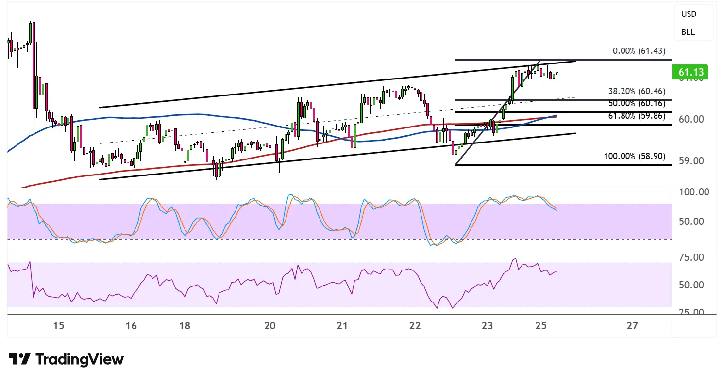 通过斐波那契回撤工具分析,可以观察到买方可能关注的支撑点位。首先是38.2%的回撤位60.46美元,随后是50%的水平60.16美元。若调整加深,61.8%的斐波那契位59.86美元可能成为多头防守的关键区域,该水平与通道下轨重合,或为维持上升趋势的最后防线。