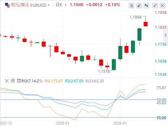 1月26日,欧元兑美元汇率在周一出现轻微下跌,当前交投于1.1840水平,此前曾一度攀升至四个月高位1.1875。市场风险情绪略有降温,加之德国商业信心数据表现平淡,对该货币对形成压制。尽管开盘时段股市大幅反弹,但日元干预忧虑对美元构成压力。