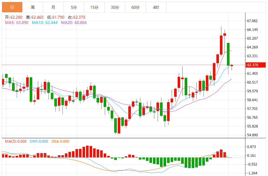 WTI原油价格在触及阶段性高点之后,进入明显的回调阶段。周二亚盘期间,价格维持在62.39美元/桶左右震荡运行。虽然此前在61美元附近获得短暂支撑,但反弹动能有限,反映出当前市场对后续走势信心不足,资金更倾向于在反弹过程中减仓。