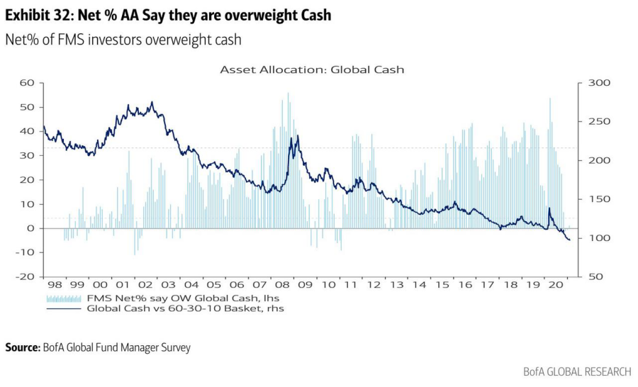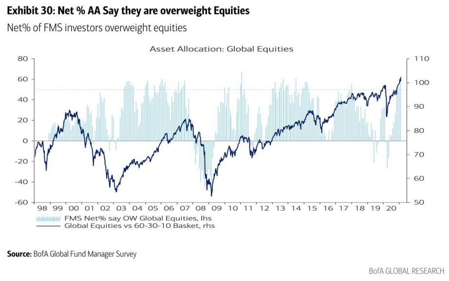 调查显示,与过去10年相比,投资者更青睐周期性股票,对大宗商品、新兴市场、工业和银行的投资较多。由于疫苗成功推出、经济重新开放以及对更多财政刺激的预期,股市在历史高点附近徘徊。