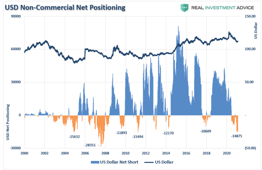 Lance Roberts认为应注意美元对股市的影响。上述报告提到,几乎所有人都预计美元继续走软,美元空仓仓位较高,而美元的下跌一直是新兴市场、大宗商品和股票走强的推动力。导致美元走势逆转的任何因素,都可能导致股市随之下跌。