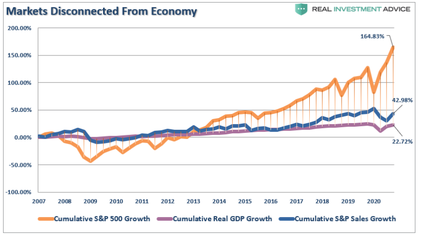 如上图所示,自2007年的峰值以来,标普500指数已经回升了164%以上,这是企业销售额增幅的3.8倍,GDP增幅的7.5倍。