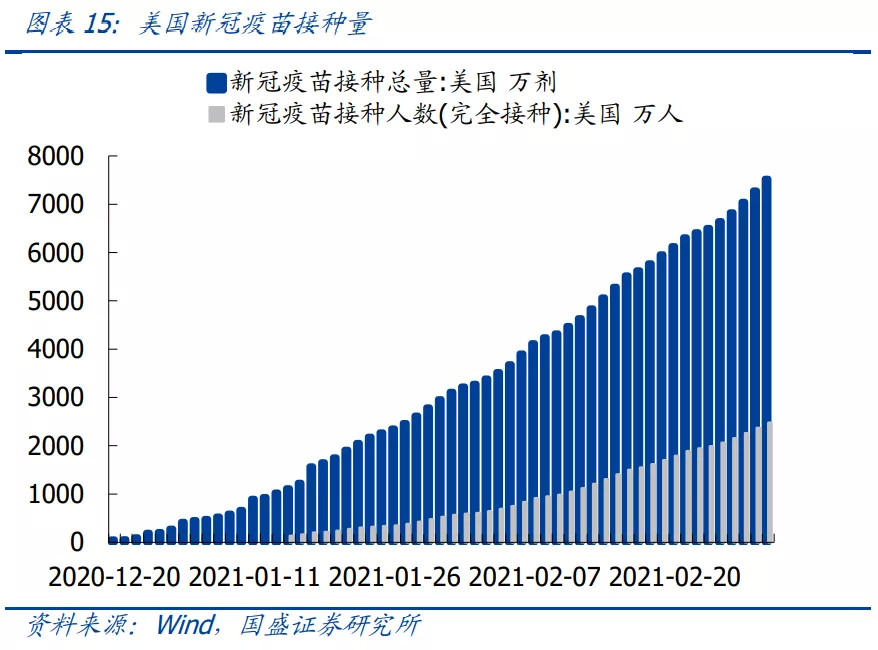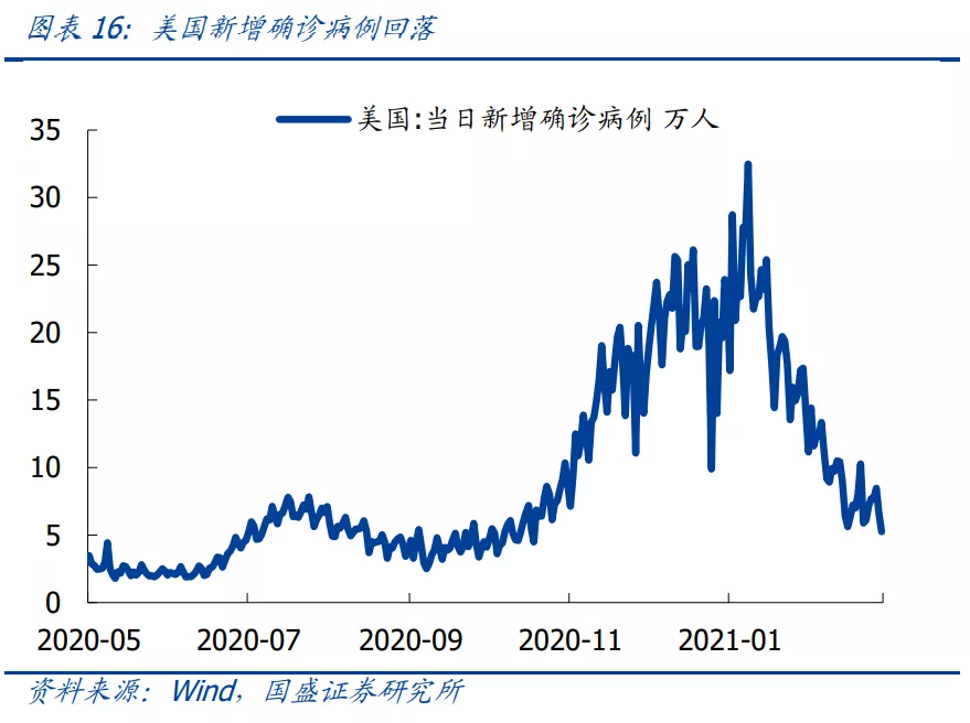 1)美国疫苗接种加速,疫情形势大幅缓解。拜登上台后大力推行疫苗接种计划,目前美国已完成7500万剂新冠疫苗注射,近2500万人完成接种,与之相对应的是美国的疫情形势显著好转,每日新增确诊病例数由年初的30万例下降至5万例左右。