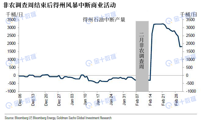 2月中旬美国得州和南部的极端天气破坏了商业活动,导致大面积停电。虽然这些是在非农调查周结束2-3天后才发生的,但天气依然被视为2月数据的一个不利因素,因为东北部和西北部在上半个月都经历了多场暴风雪。