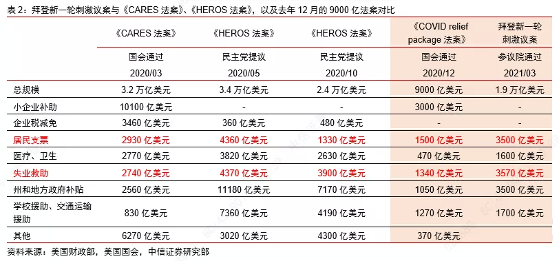 总体来看,当前参议院通过的议案在内容上有增有减,只是将部分减少的资金用于其他条款,刺激规模上并无明显变化,我们预计此轮总的财政刺激规模在1.8-1.9万亿美元左右,高于此前市场预期的1.5万亿美元。