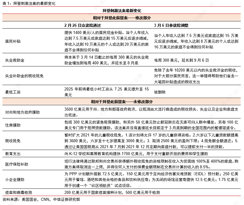 1)居民支票:收紧了个人现金补贴的发放标准。将获得现金补贴的收入门槛由个人/家庭年收入在10万/20万美元以内收紧至年收入8万/16万美元以内。预计现金补贴覆盖人数占比将由93%下降至90%。