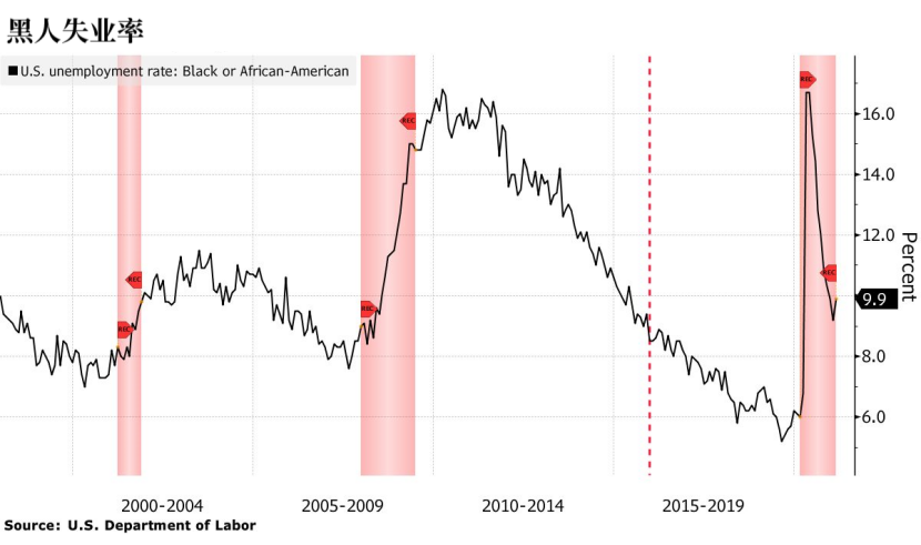 去年4月和5月,疫情让黑人失业率飙升至16.7%。到今年1月,这一比例已回落至9.2%。但美国劳工部上周五公布的数据显示,上个月黑人失业率又出现了逆转,上升至9.9%。