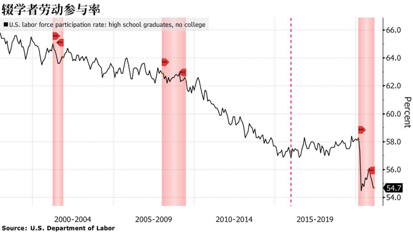 鲍威尔还特别强调了那些没有受过大学教育的人的劳动力参与率,疫情对他们产生了巨大的影响。美国劳工部上周五公布的数据显示,截至上月,他们的参与率仅为54.7%。