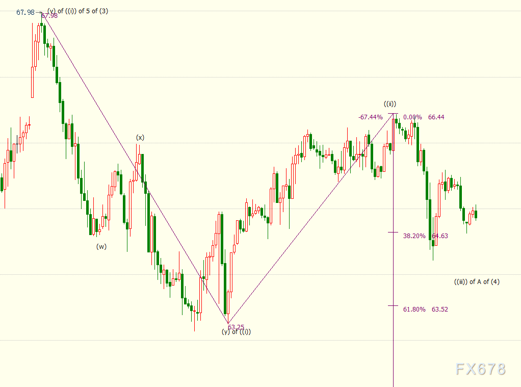日线图上看,NYMEX原油或已在67.98美元结束自33.64美元开启的上行(3)浪走势,并开启回调(4)浪走势。(4)浪料由A、B、C三个一级子浪组成。