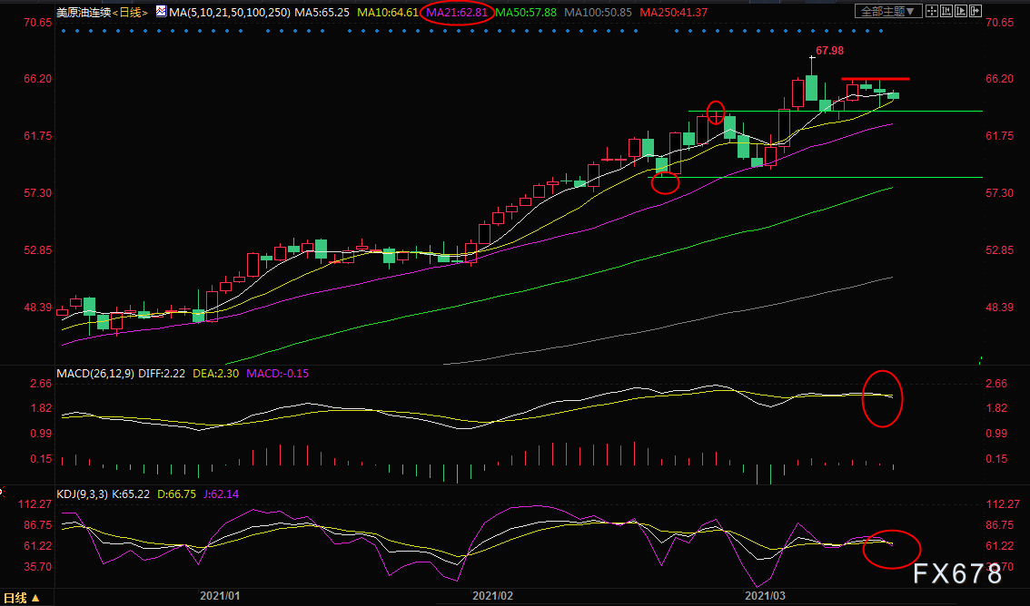 周二(3月16日)亚洲时段,美原油小幅走弱,目前交投于64.82美元/桶,因担忧美国库存上升,而且德法等国暂停疫苗接种威胁石油需求,分析师预计库存将实现又一周增长,这令油价承压。技术面来看,油价短线上涨动能衰竭,短线面临较大的下跌风险。