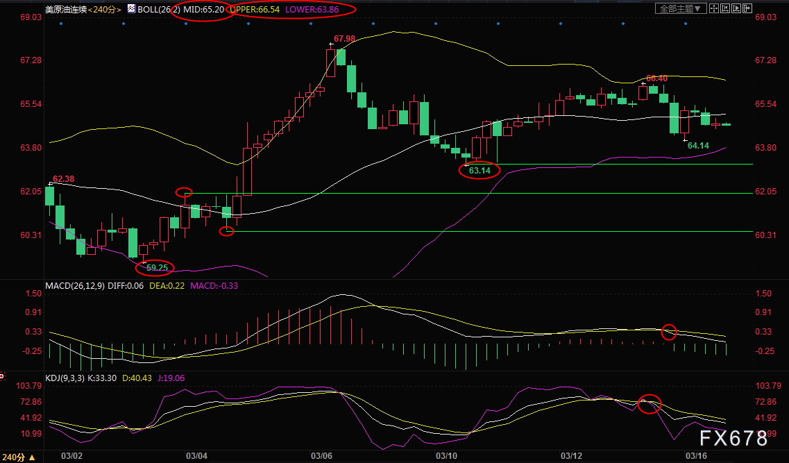 4小时级别:震荡;布林线轨道水平运行,有收口迹象,留意布林线轨道63.86-66.54区域突破情况,目前MACD死叉,KDJ死叉,油价偏向试探布林线下轨63.86附近支撑,如果失守该支撑,则有望打开下跌通道。