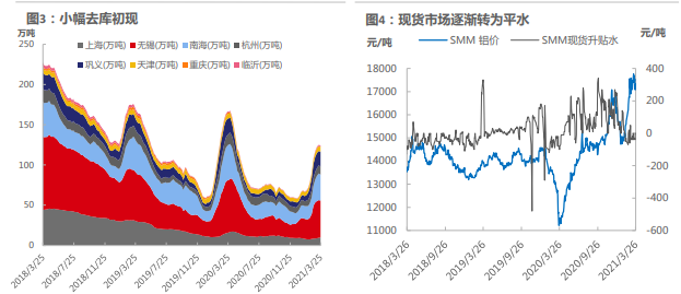 本周(3.22-3.26)沪铝主力2105合约震荡下移,周内探底16480元/吨,截止周五, 主力沪铝2105合约收于17420元/吨,周内上涨5元/吨,其中周二沪铝一度触及跌停板。 周内主因高位铝价下,受市场传闻国储铝锭影响,前期多头获利恐慌出逃,使得沪 铝重挫探底,但因此事并未任何官方依据证实,恐慌情绪过后市场再度回归基本库存拐 点的到来符合此前市场预期,加之底部下游备库意愿增加,使得沪铝触底反弹,修复了 部分周内下跌。