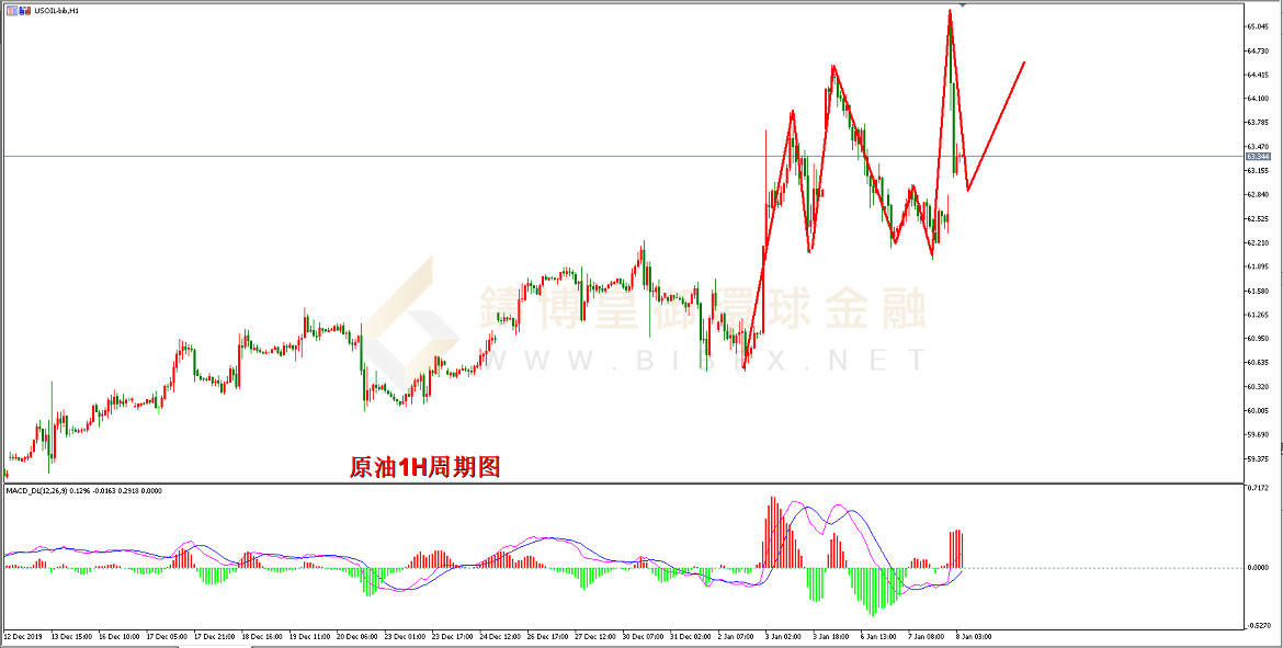 从美原油一小时走势结构看,处在高位拉升震荡的过程中,早建议的行情拉升目前已基本修复,同时短线下跌走势也开始力竭,预计行情短线企稳后将有望再次试探高位。从1H周期MACD来看,MACD快慢线从零轴下方金叉上穿零轴,虽行情修复早间涨幅,但MACD动能柱仍处在持续放量的过程中,说明市场多头动能充沛,行情回踩企稳后,有望再次上攻,故日内策略上建议尝试多单为主。