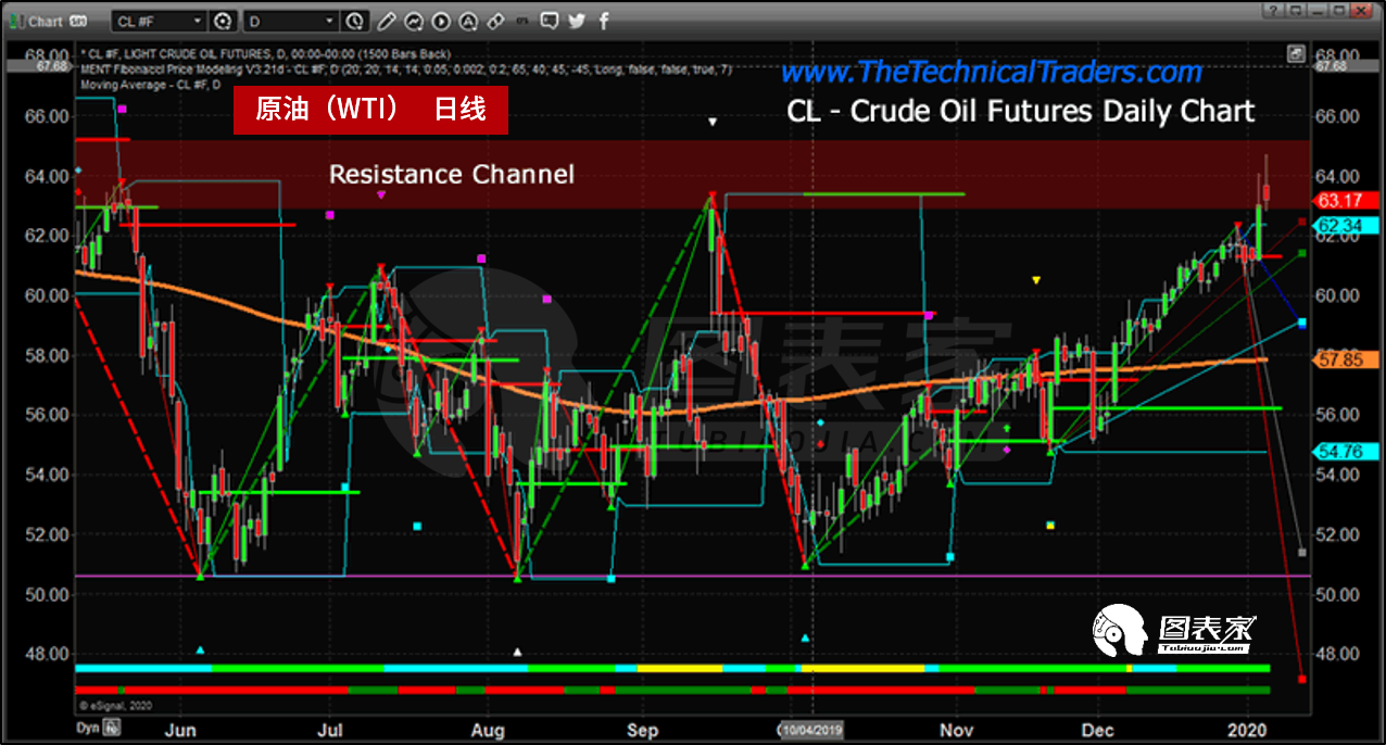 下图为原油日线走势图,油价早盘大幅走高,测试关键阻力位65美元后回落。全球投资者认为,美国与伊朗的冲突不会立即导致任何类型的大规模石油供应中断或全球市场风险,这表明油价短期内或将进一步回调。
