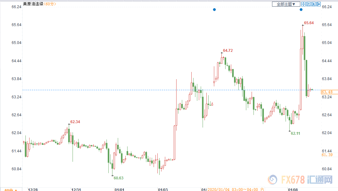 周三(1月8日)亚市早盘,美油大幅一度飙升近5%,刷新8个月高位,因有报道称,伊朗对驻有美军的伊拉克空军基地发动袭击,伊朗革命卫队称向伊拉克西部安巴尔省的阿萨德空军基地发射了35枚火箭弹,这令市场对于原油供应中断的担忧情绪大幅回升。