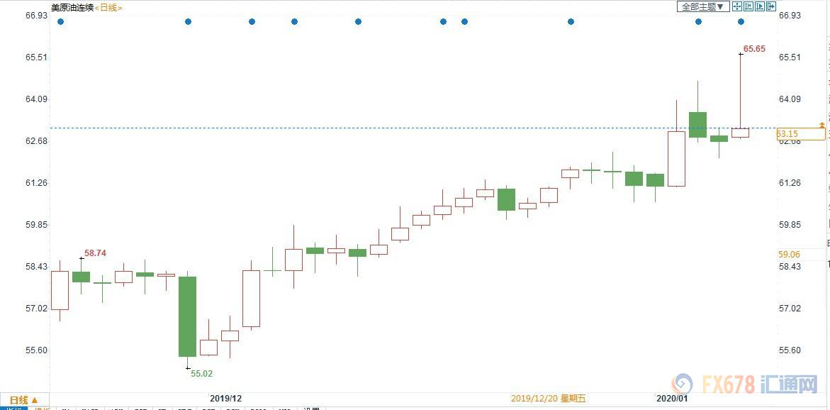 周三(1月8日)国际油价一度飙升5%至65.65美元/桶,因周三早间数十枚火箭弹袭击了伊拉克西部安巴尔省的阿萨德(Ain al-Asad)空军基地,这一位于叙利亚边境附近的空军基地驻有美军。这是伊朗针对美国采取的复仇行动,此前美国在巴格达空袭了伊朗高级军事领导人卡西姆·索莱马尼(Qassem Soleimani),导致中东局势紧张。
