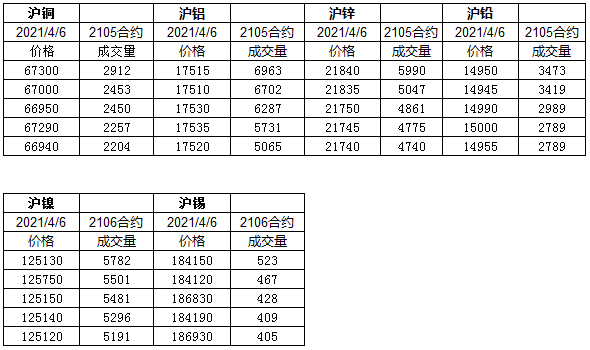 2021年4月6日上期所金属主力市况