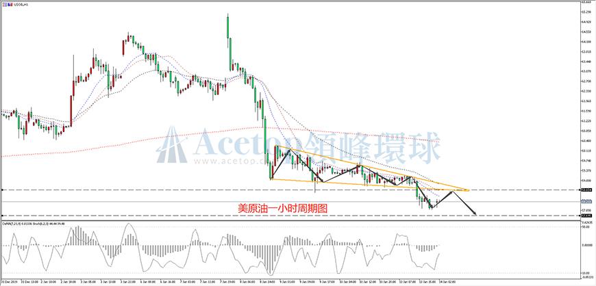 美原油上个交易日,形成明显下倾三角收敛调整结构形态,但是由于美原油持续未见多头动能,最终市场选择继续下破。日内最低下探至57.91附近。当前一小时周期图中,20日均线由此前的粘合状态,再度形成空头排列走向。随着调整窗口的突破,美原油的下跌空间再度被释放出来。不过亚盘时段,美原油有一定止跌企稳的迹象,附图OSMA量能柱开始收敛,并逐步呈现回归零轴上方的倾向,预计油价回归58.62附近阻力位有望形成日内多空拐点。操作上建议选择阻力位尝试做空的思路。