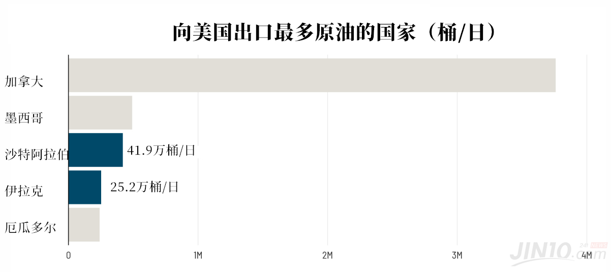 根据EIA数据,美国从沙特、伊拉克、科威特和阿联酋这四个波斯湾沿岸国家进口的原油最多,总量达到87.5万桶/日。其中从沙特进口的原油总量更是高达41.9万桶/日,从伊拉克进口的原油总量也达到25.2万桶/日。