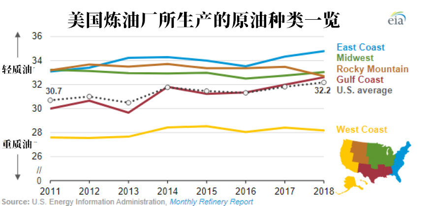 目前美国的炼油厂很多是上世纪末建成的,当时世界范围内重质油供应充足并且价格便宜,所以美国作为当时的石油进口大国,在墨西哥湾沿岸布局了大量炼制重质石油和中质石油的炼油厂。