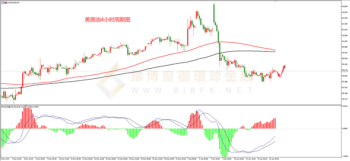 美原油近期一直延续震荡下行走势,多头上涨动能非常弱,但昨日价格在美盘时段快速回落至57.60附近,随后迅速企稳,并且突破了此前一直压制价格的趋势线,短期呈现出多头的反弹动能。从天图周期MACD看,双线在零轴下方,但动能柱不断缩减,4小时周期DIFF和DEA在向零轴方向运行与回归,1小时周期在零轴上方运行,目前美原油从技术面来说已经开启了反弹走势,因此日内策略建议以逢低做多为主。