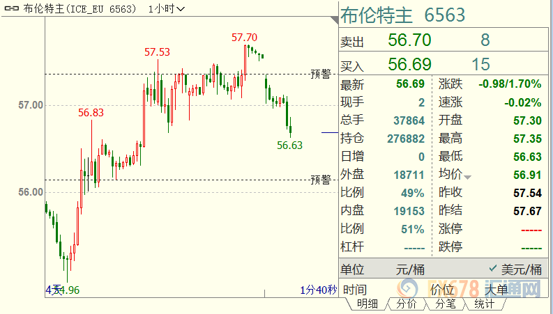 北京时间16:57,NYMEX原油期货下跌1.38%至51.60美元/桶;ICE布伦特原油期货下跌1.68%至56.70美元/桶。