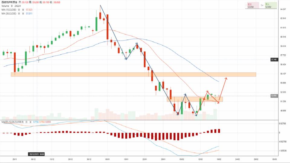 技术面来看,此次油价自高位65.00附近下跌至今五浪特征明显,3浪末端、4浪和5浪共同构筑了双底的底部形态。昨日原油行情的下跌,一方面价格幅度和持续市场与波浪中B浪回撤走势对应,另一方面其也是从形态的角度对日线51.68颈线附近支撑位的回测。观察1小时、4小时周期,MACD自初次触碰52.00支撑位至今处于持续背离待修正状态。这些都会技术面多头入场提供了足够信心,美油价格在接下来的稍短时间内可能将会进一步反弹至54.00附近。