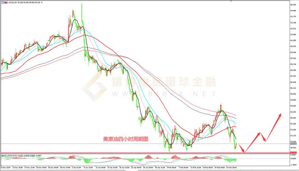 美原油昨日再度暴跌,最低点触及49.70,最大跌幅超过4%。今日早间开盘后,美原油小幅反弹,当前交投于50.30附近。早间美国石油协会公布的API数据小幅利多,使得美原油有所反弹。从下图美原油四小时周期图来看,截至目前,美原油本轮下跌的最低点位于49.40,预计该位置将成为原油接下来的多空转折点。另外在操作上值得提醒投资者的是,从均线来看,美原油目前是倾向于继续走空的,但是空头进场点需要等待跌破49.40才好出击,在该关键位没有进一步下破之前,是可以尝试在支撑位置做多的。
