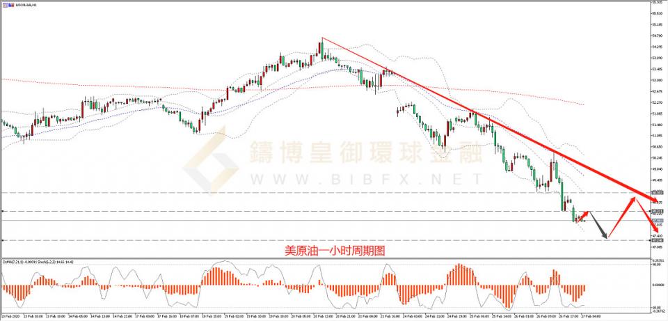 美原油昨日整体上再度深跌超过4%,一直延续到亚盘市场依然不见明显多头反弹的迹象,由此可见原油市场因全球需求不足造成的恐慌性抛售情绪并未就此结束。隔夜美盘初期油价出现相对不错的反弹幅度,但是自EIA数据之后,市场抛售情绪再次出现加剧,最终日线以饱满长阴收线,就此美原油已经形成天图到一小时级别的共震性空头趋向。从一小时周期来看,美原油呈现较为明显的空头下跌通道,高低点也同步出现逐步下移,均线组合也继续维持空头排列。附图OSMA量能柱持续位于零轴下方运行,由此可见原油弱势局面短期难以出现根本性扭转,因此日内操作上仍然建议以高空为主的思路。