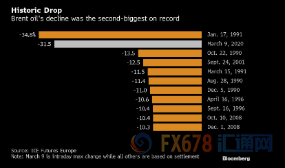 ② 以下图表展现了今天原油市场这个具有历史性的日子,布伦特原油价格创出了历史第二大跌幅。周一亚洲交易时段早盘油价跌幅巨大。全球基准布伦特原油价格开盘不久便暴跌逾31%,创出了1991年海湾战争以来的最大跌幅。WTI价格也一度下跌28%,并因跌幅太大而导致交易一度中断了几分钟。