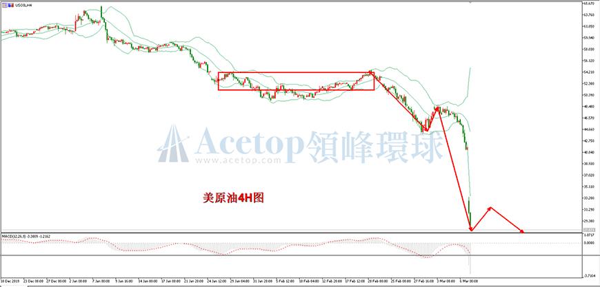 美原油四小时走势图上来看,今日大幅低开,一举破掉前期重要支撑位,呈现明显的趋势下行走势。从布林带指标来看,开口被向下打开,价格沿布林带下轨运行,是明确的空头行情;从MACD指标来看,快慢线在0轴下方运行,且未出现背离信号,也预示着后市有较高概率走空头走势。建议日内投资者以做空的思路为主,空单入场位置可以参考30.00区间,该区间是重要的心理关口,不被有效突破,行情有较大概率延续空头走势。