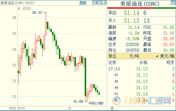北京时间17:10,NYMEX原油期货暴跌5.61%至31.13美元/桶;ICE布伦特原油期货暴跌5.87%至33.69美元/桶。