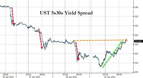 在长债收益率周一上演超级大逆转后,美债收益率曲线重新趋于陡峭。5年/30年期美债收益率差在周一盘中曾触及107.80个基点,为2020年8月以来最窄,但随后令人瞠目结舌地大幅走阔至123个基点。2年/10年期美债收益率差也在触及2月以来最窄后重新扩大至了124个基点。