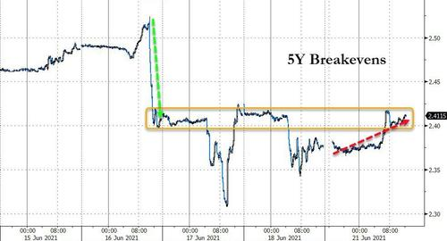 反映市场对未来5年通胀预期的重要指标——5年期盈亏平衡通胀率,上周曾一度在美联储决议后从2.50%上方的高位跌至了接近2.30%水平,而本周一该指标重新反弹。美国方面本周晚些时候将公布备受瞩目的PCE物价指数,这暂时止住了市场通胀预期的回落态势。