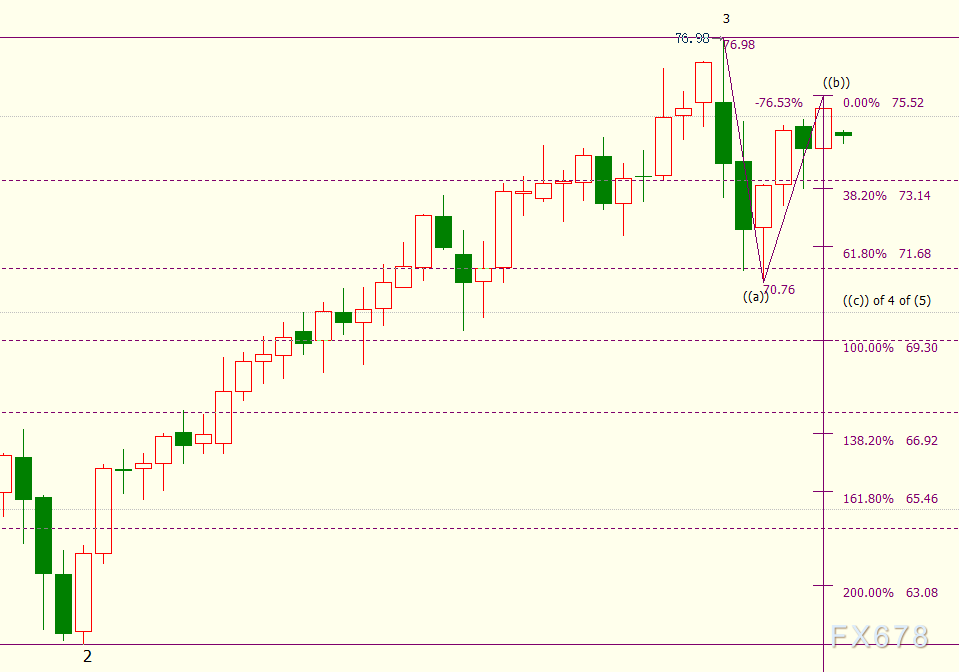 日线图上看,NYMEX原油处于自75.52美元开启的下行(©)浪,下方100%目标位在69.30美元。(©)浪是自76.98美元开启的调整4浪的子浪,