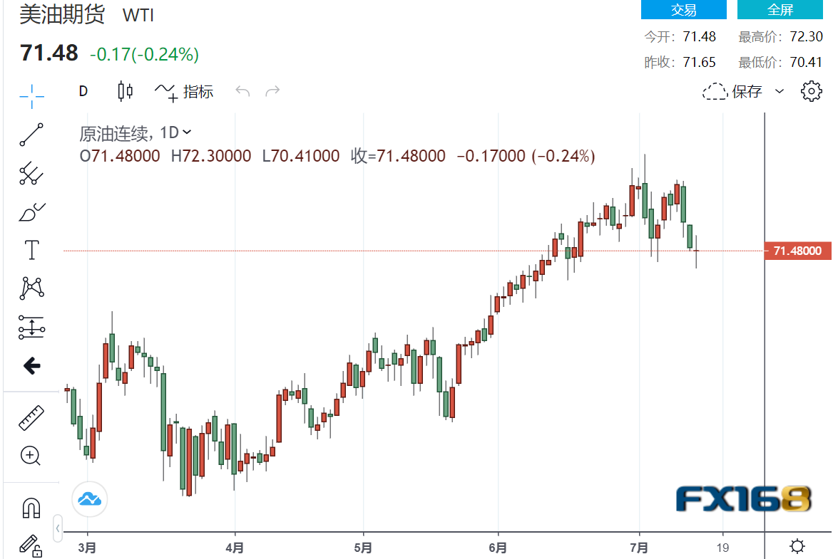 油价周五(7月16日)在震荡中小幅收涨。截至发稿,美国WTI原油8月期货收涨16美分,涨幅0.22%,收于71.81美元/桶。本周,美油累跌将近4.0%,创3月份以来最大单周跌幅。布伦特9月期货当日收涨12美分,涨幅0.16%,报73.59美元/桶。